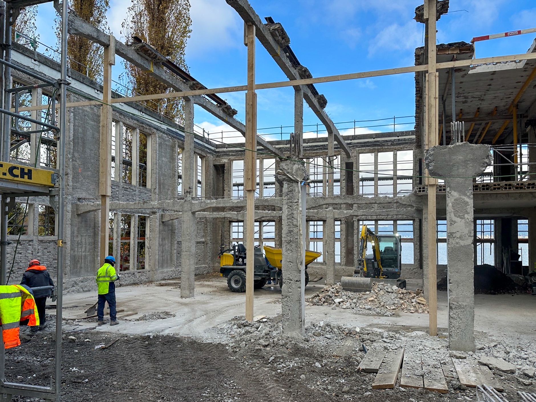 Totalabbruch der Nebengebäude. Innenrückbau zu Rohbau des unter Denkmalschutz stehenden Fabrikgebäude sowie des dazugehörigen Seegebäudes welches ebenfalls unter Denkmalschutz gestanden ist. Totalabbruch. Sanierung der Denkmalgeschützten Anlagen. Anlage direkt am See stehend. Schadstoffsanierung der geschützten Anlage.